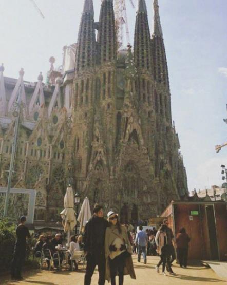 和妻子昆凌依偎在巴塞罗那圣家族大教堂前的照片。照片中昆凌用手轻抚孕肚甜美微笑,周杰伦则目视娇妻一脸宠溺。