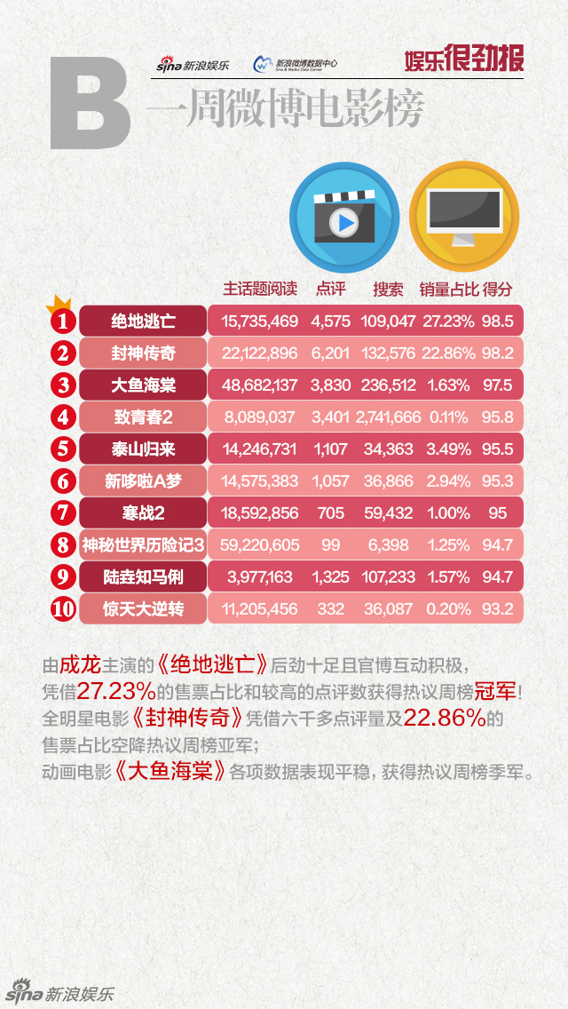 上周张艺谋《长城》发布首款预告登顶覆盖人次排行榜,吴亦凡献唱《夏有乔木雅望天堂》主题曲人气旺备受女性粉丝青睐。