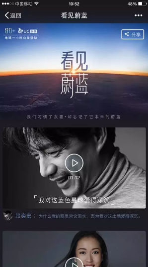 公益方面,得益于“爱豆”流量磁性的得力施展,在“千棵树”为期一周的活动中,相关公益资讯的阅读人数就高达3000万之众。此外, UC携手世界自然基金会(WWF)开展的 “地球一小时—看见蔚蓝”活动同样可圈可点:柳岩、段奕宏与吉克隽逸将“爱豆力”化作诗歌来传播关爱地球这一倡议,并获得了大量用户的支持与聚焦,最终促发了UC“最公益明星榜单”的设立。