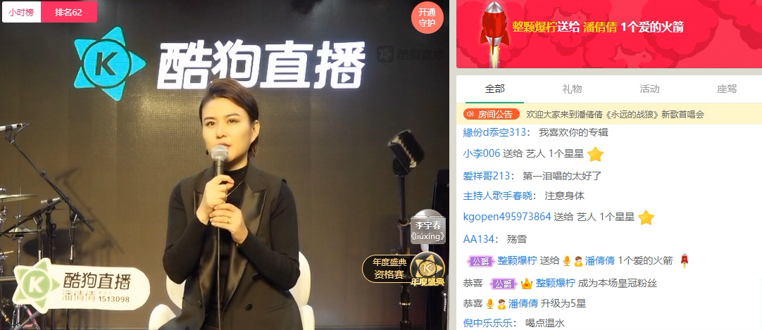 俗话说闻名不如见面,但是看着直播间里的潘倩倩,小编实在不敢确信这么一位看起来与其他女生无异的姑娘,怎么能唱出那么低沉稳重的音调音色。然而潘倩倩现场的一首《在此刻》,直接刷新了小编我对“倩倩”二字的认识,原来“倩倩”也能蕴含着如此大气磅礴的歌声。如果说王菲的歌声是细腻得如水般浸润听者的心灵,那潘倩倩的歌声就是仿佛擂鼓的鼓声冲击着听者的灵魂。酷狗网友们都仿佛被歌声冲散了自己的三魂七魄,除了不停地用手敲击数字6以外都找不到其他表达自己的方式了~
