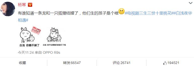 国华娱乐2月14日报道 劳模杨幂竟没撒狗粮:用心宣传热播电视剧。在这个全民都在秀恩爱撒狗粮的日子里,杨幂居然还在宣传她的热播电视剧《三生三世十里桃花》。。。今日中午11:24杨幂发微博:有谁知道一条龙和一只狐狸结婚了,他们生的孩子是个啥?见过敬业的女演员,但如果有人说你第一,我不敢反驳。