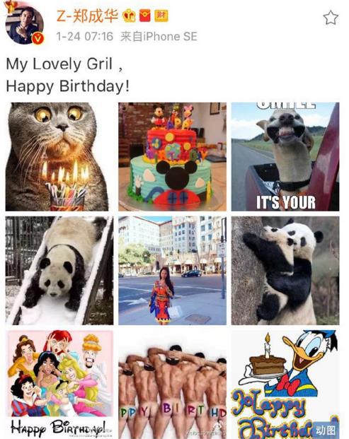 国华娱乐1月24日报道 郑爽爸爸发给妻子的生日微博 暴露其英文水平!今天是郑爽妈妈的生日,郑爽爸爸郑成华一早就发微博祝贺妻子生日快乐,并配图九宫格,中间是今天的女主角郑爽的妈妈。而其余的八格配图都是采用动物及卡通图案。“My lovely Gril,Happy Birthday!”