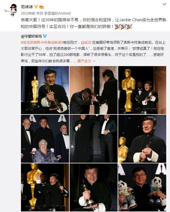 成龙曾经说过,不希望自己有一天拄着拐杖去领一个安慰奖,一定要趁有精力的时候做更多的事。而昨日他成为了有史以来最年轻的奥斯卡终身成就奖获得者。他特别邀请了自己的多年老友史泰龙一同见证,“多年前,我曾在史泰龙家看到过他的小金人,还好奇地摸了一下。今天,我也把他请来了。”