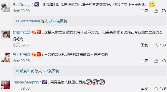 但是还是有不少网友不买账:“王菲的歌确实跟以前不在一个层次啊”“果然情人眼里出西施啊”不过还是有网友客观评论道:“谢霆锋挺自己女友无可厚非,龚琳娜从专业角度指出王菲唱功不行也是没毛病啊”