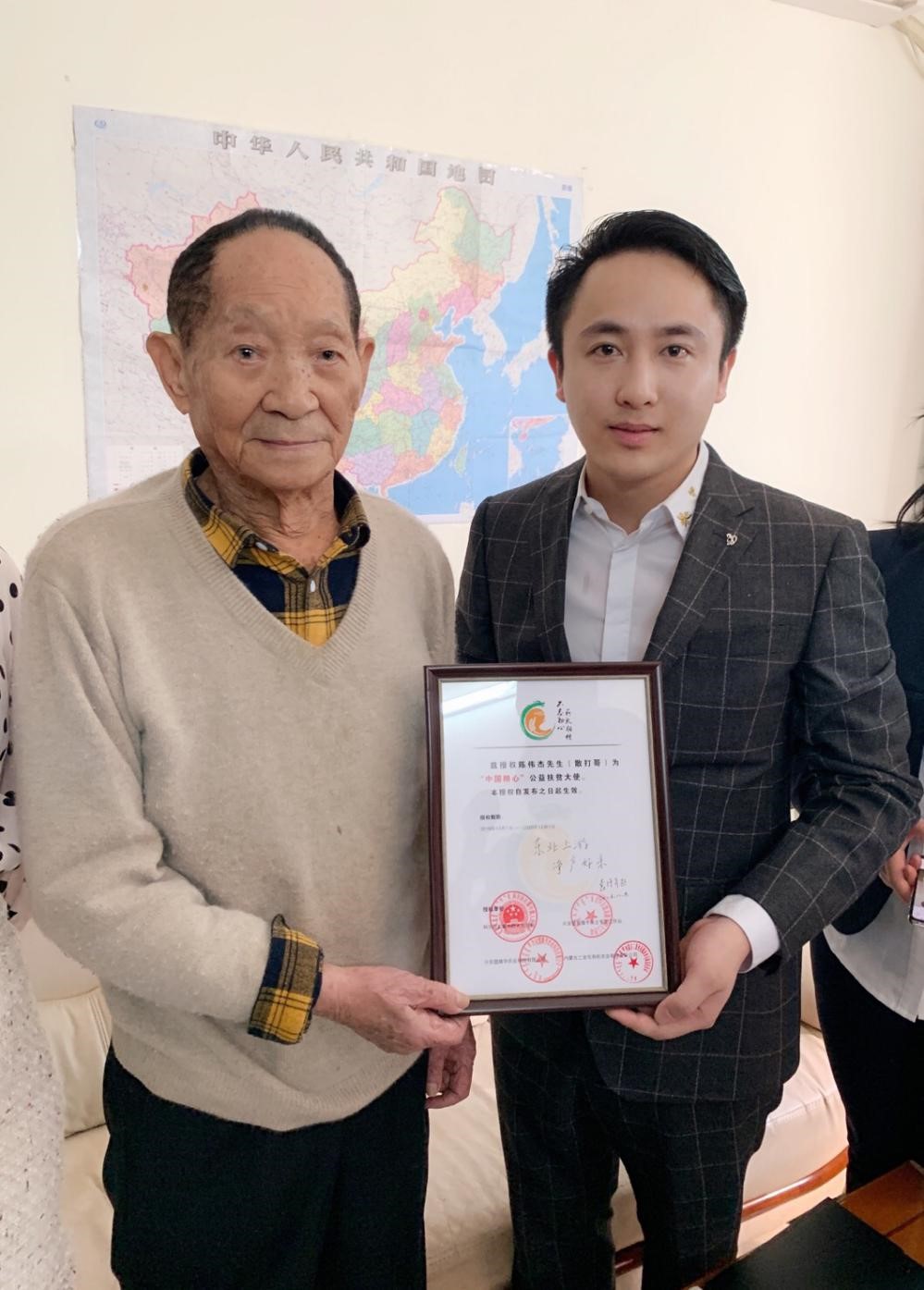 2019年12月10日上午,中国工程院院士、杂交水稻之父、共和国勋章获得者袁隆平在位于海南三亚的湖南杂交水稻研究中心海南基地,会见了广东省爱心扶贫助农大使、有“快手一哥”美誉的陈伟杰(散打哥),并授予其为“中国粮心”公益扶贫大使。