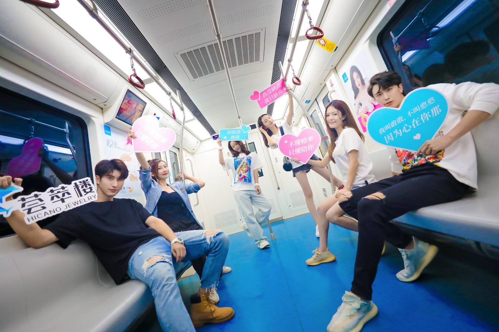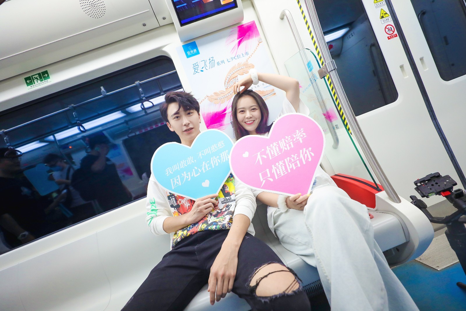帅哥美女手持卡牌在七夕专列上拍照打卡