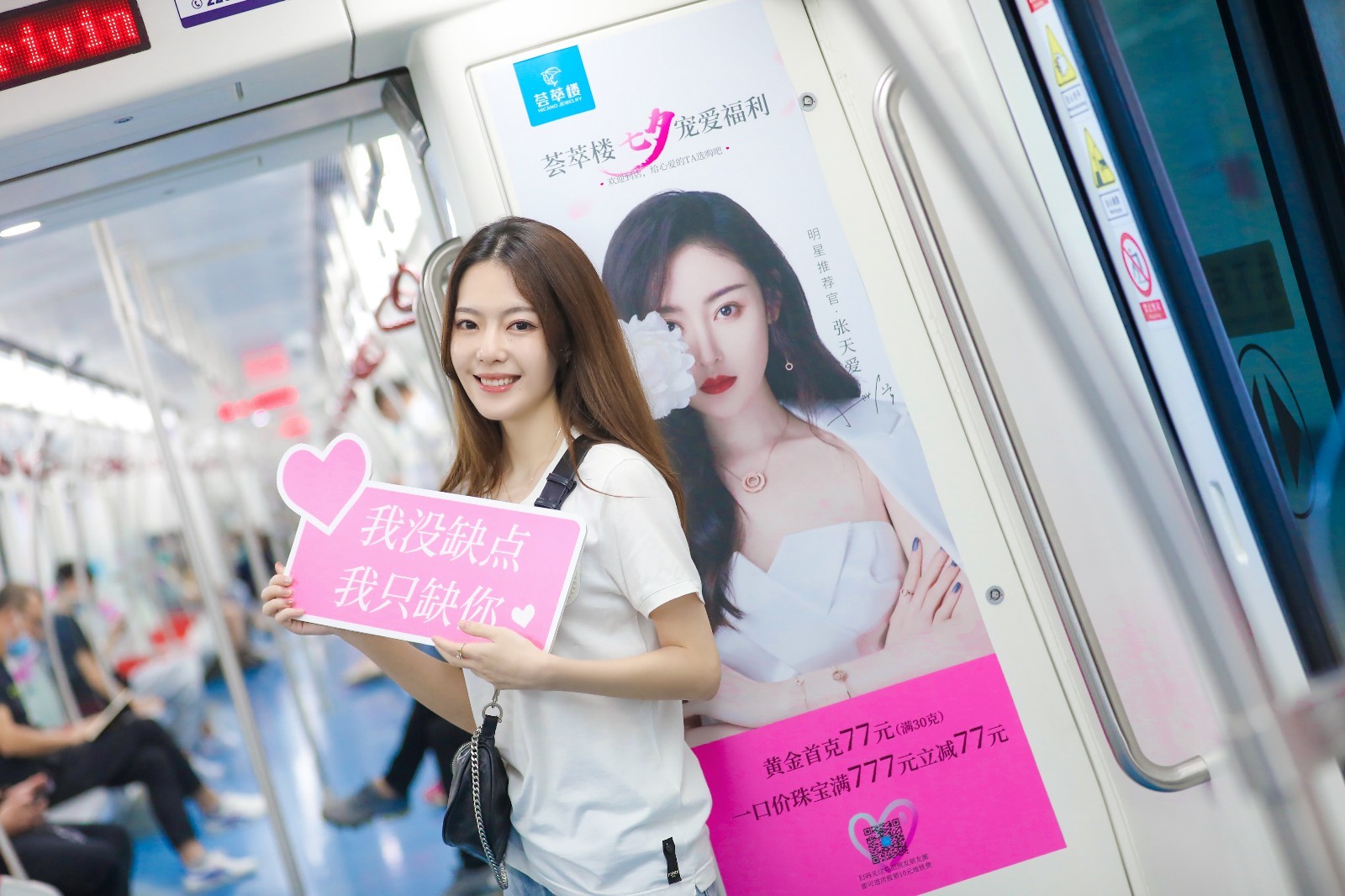 车厢内,荟萃楼珠宝代言人张天爱和新品爱飞扬系列海报装饰着车厢,映入人们眼睑。爱飞扬系列——自然柔美的羽毛,呈现着现代女性身心轻盈、自由随性的状态,通过首饰语言来承载女性的真善美,意在见证当代女性独立的爱情观。作为七夕挚爱告白礼,爱飞扬系列现已C位上市,并受到许多年轻女性的青睐!